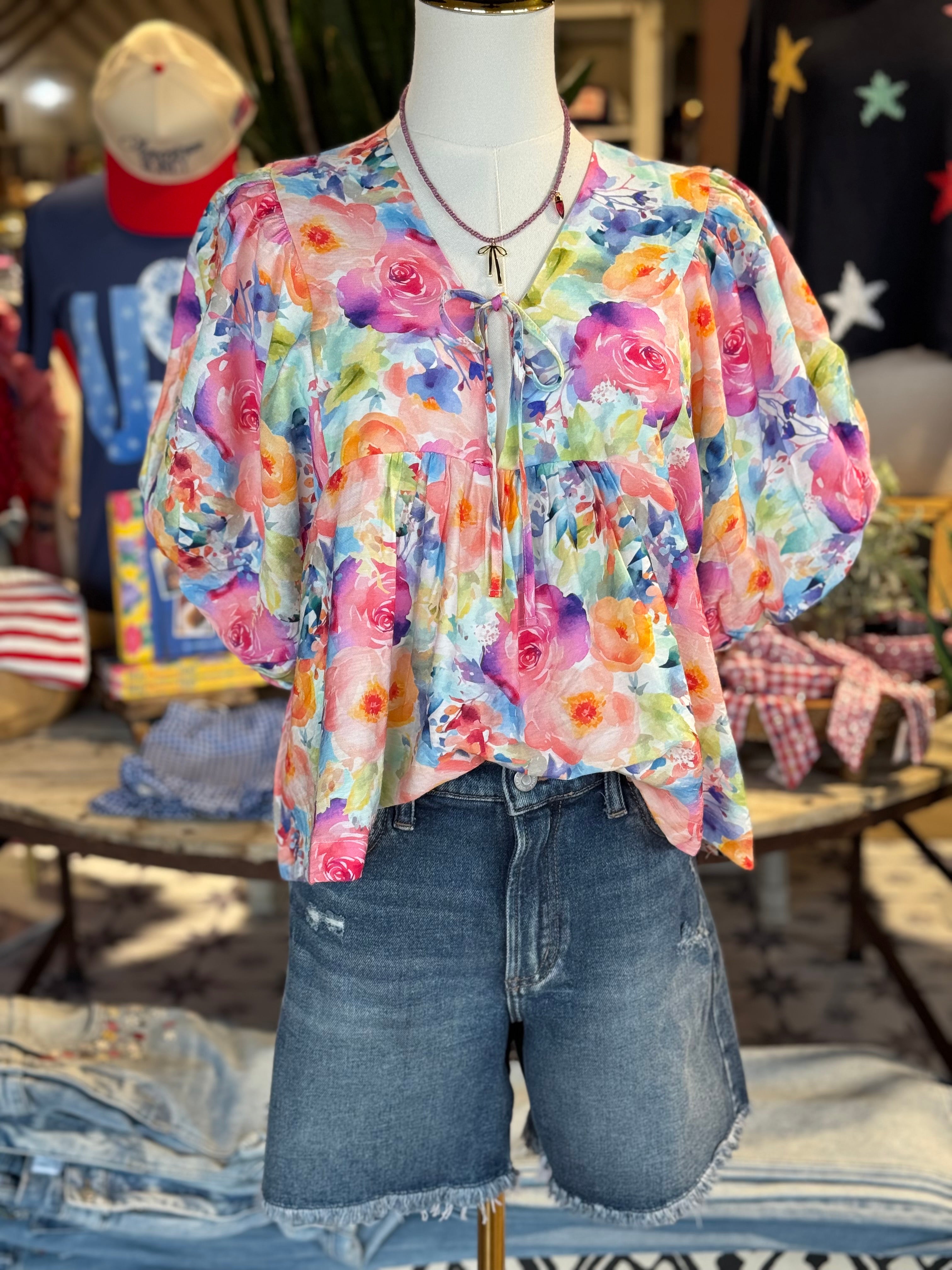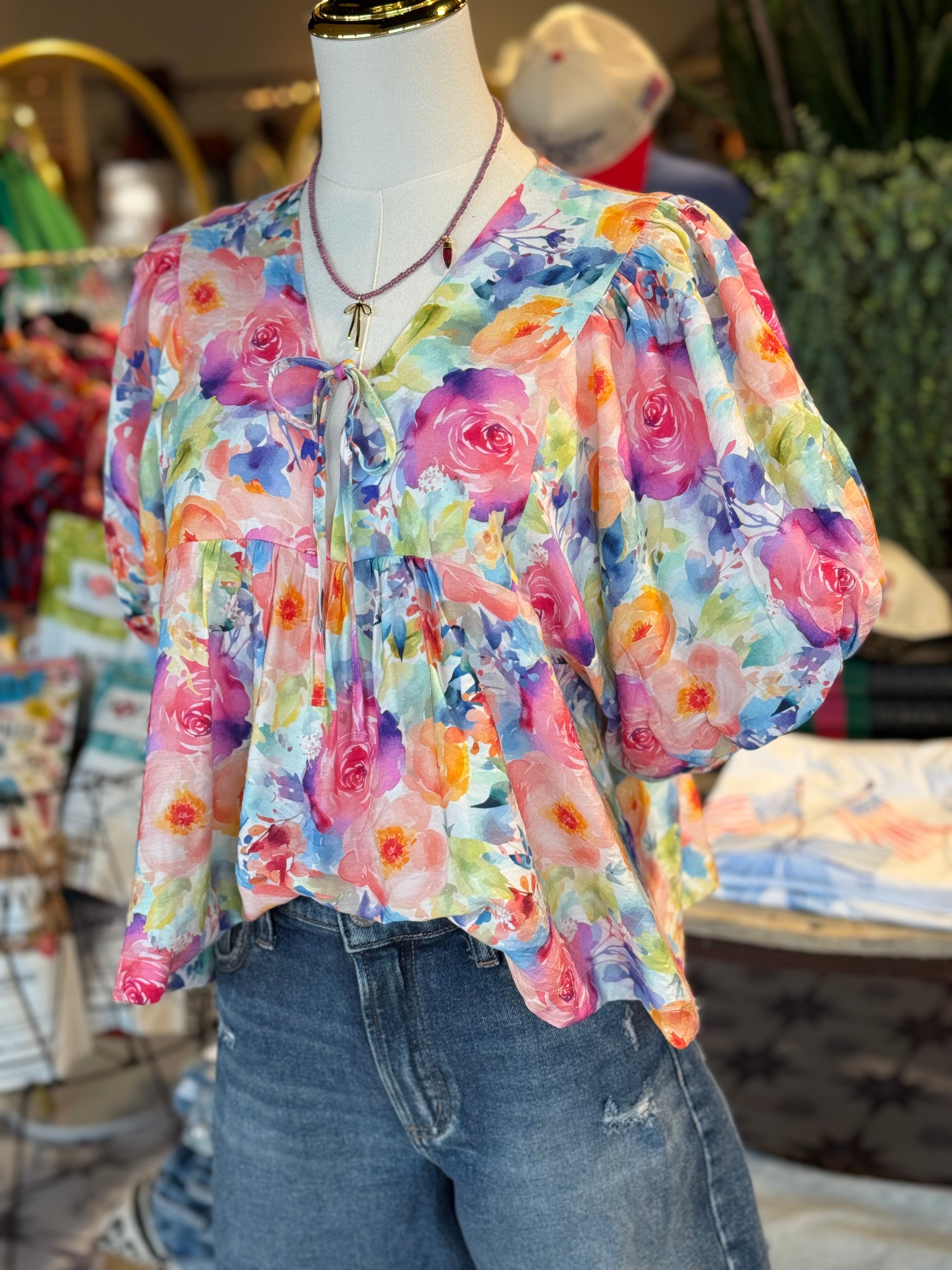 The Phoebe Top combines a beautiful floral print with balloon sleeves and a front tie, all in a vibrant color palette. Lined for added comfort, this top is perfect for adding a pop of color to your wardrobe. Embrace style and comfort with this must-have piece.