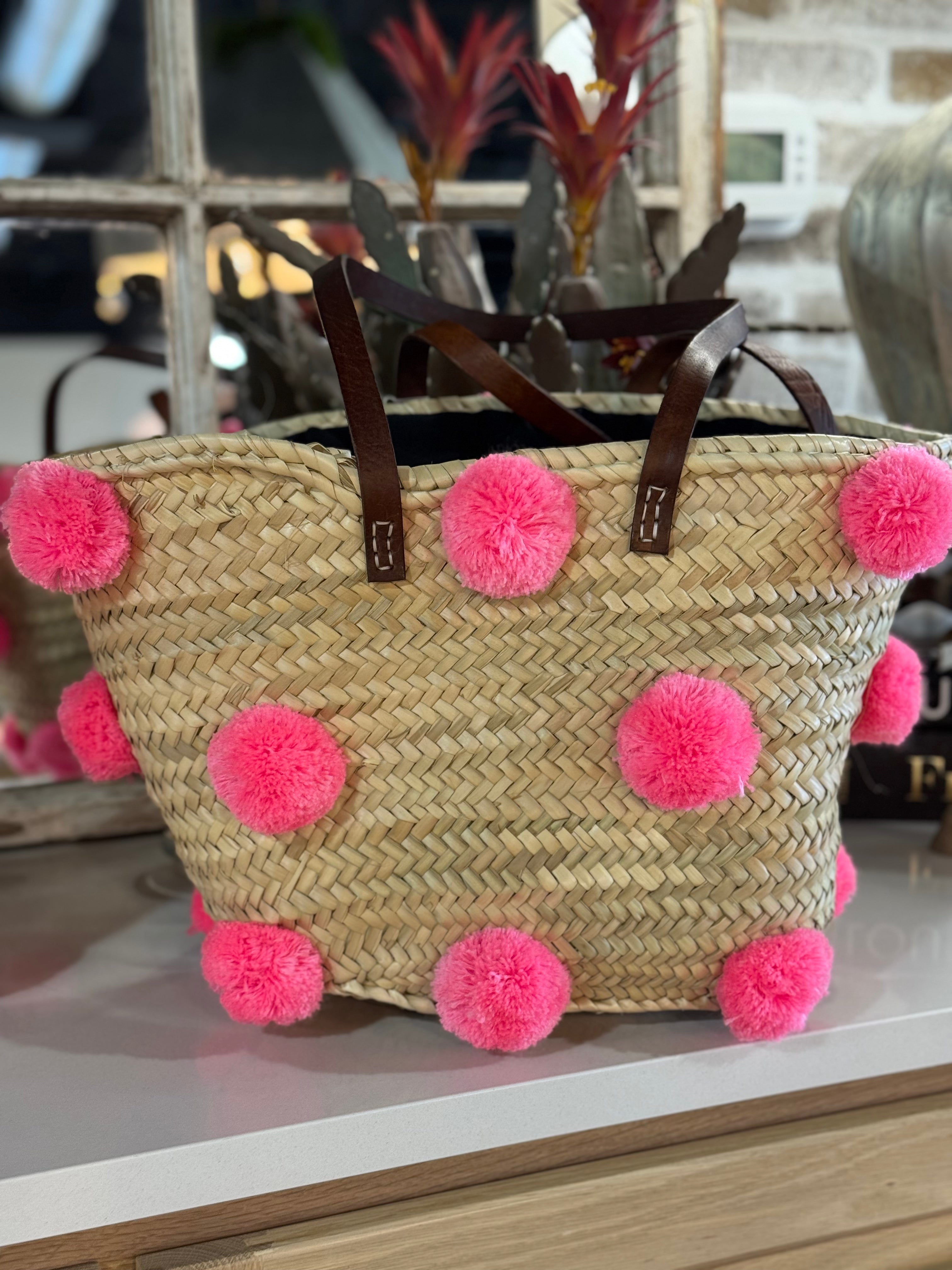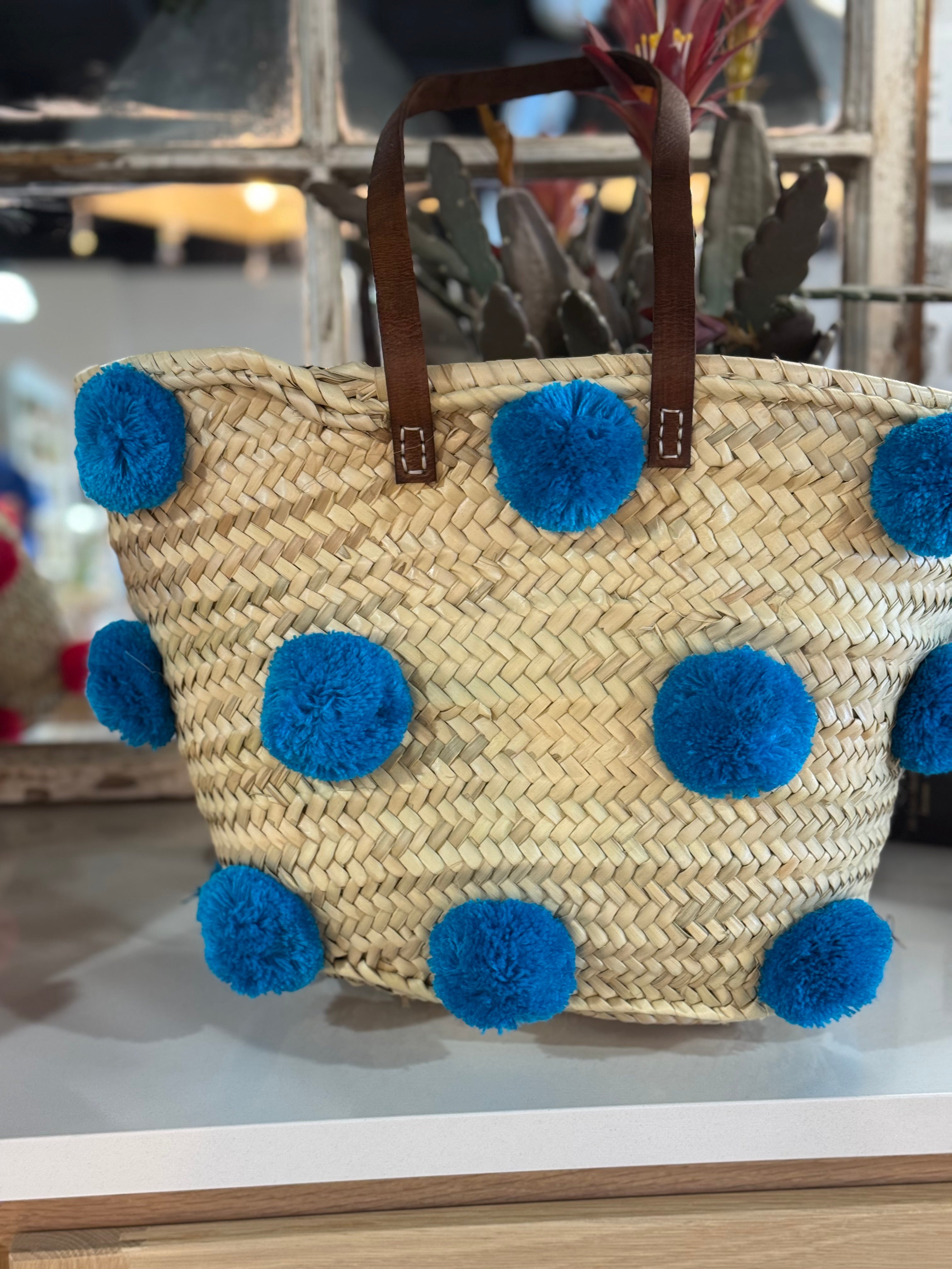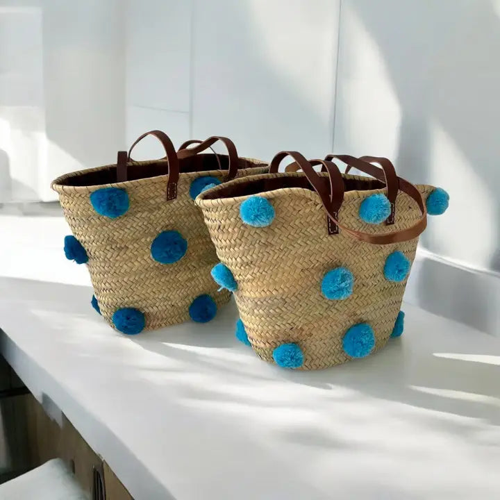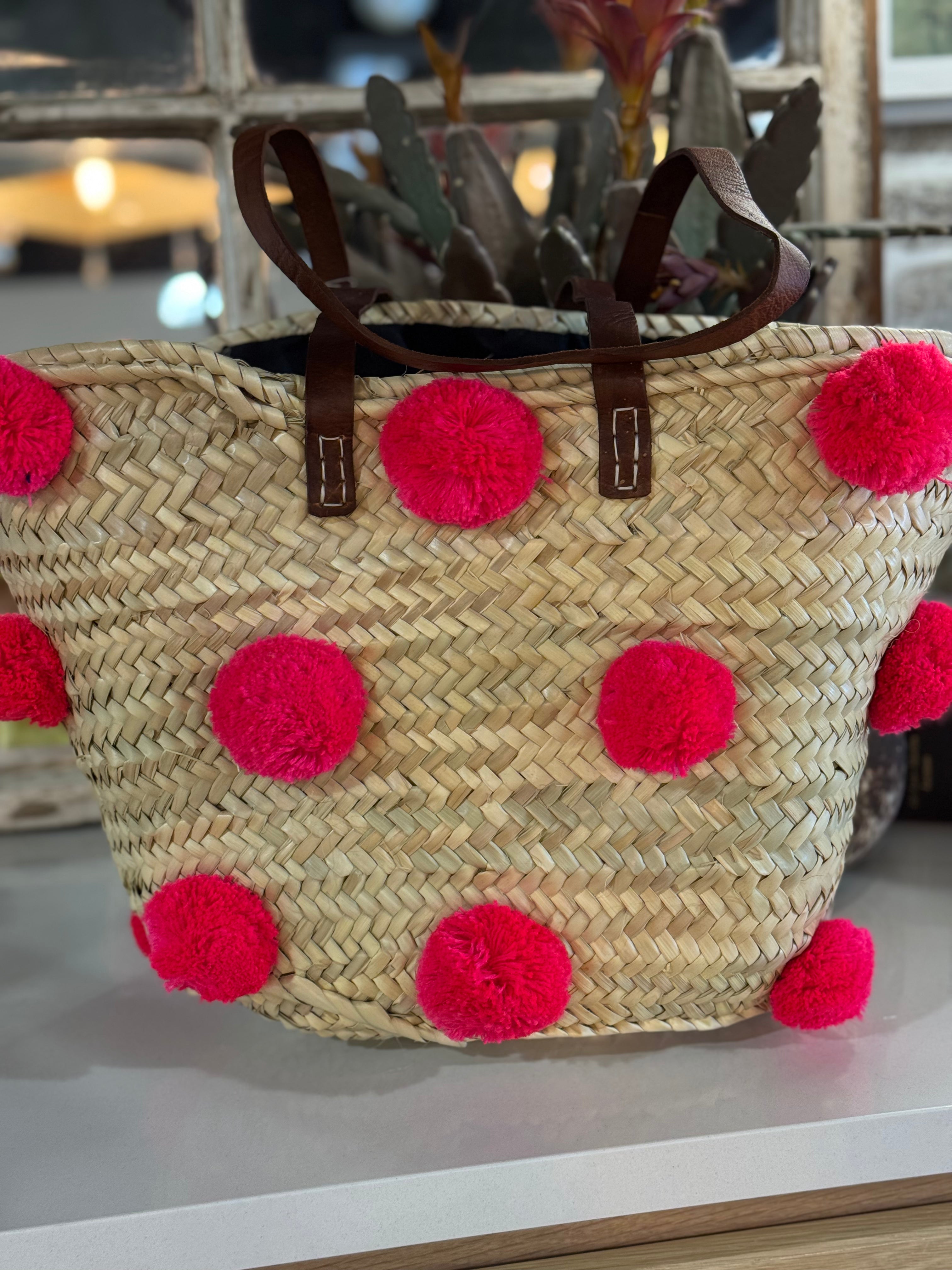 - Natural Materials: Handwoven straw complemented by soft and colorful pompoms. - Sturdy Leather Handles: Durable and comfortable for easy carrying. - Colorful Pompoms: Available in various colors to suit your style or decor. - Versatile Design: Ideal as a tote, shopping basket, beach bag, or decorative storage. - Handmade Craftsmanship: Each piece is crafted with care for a unique and artisanal finish.