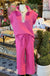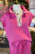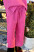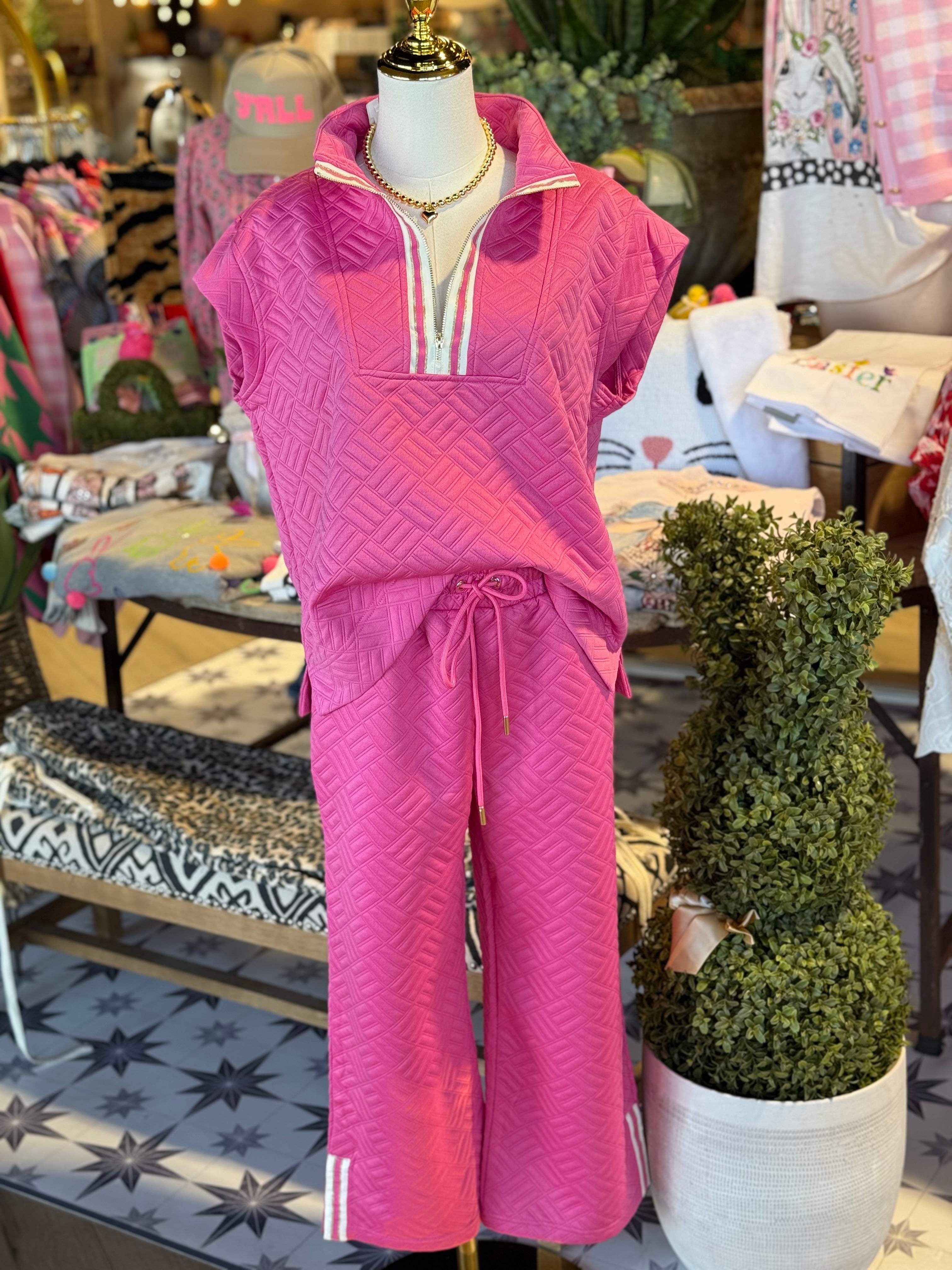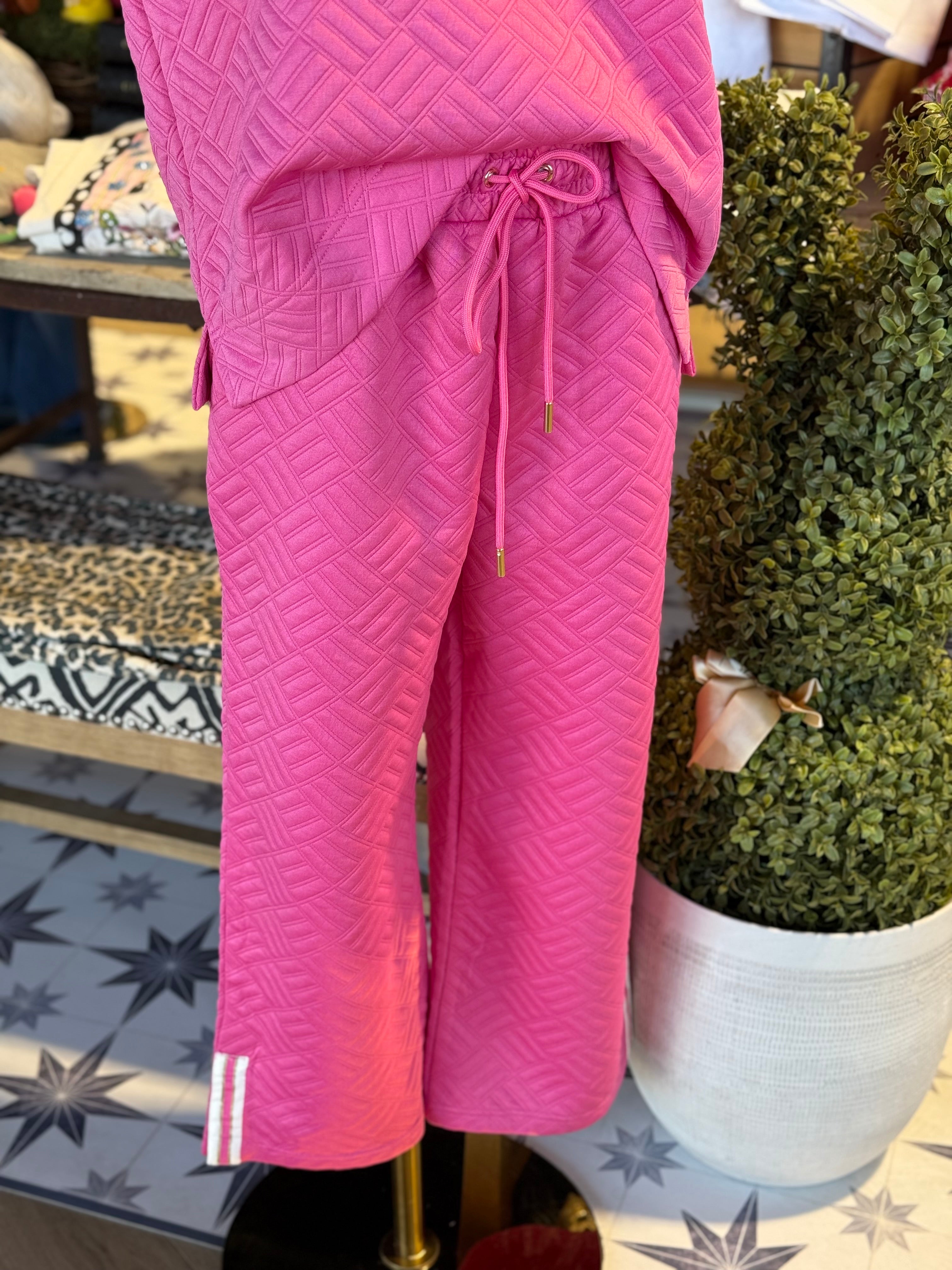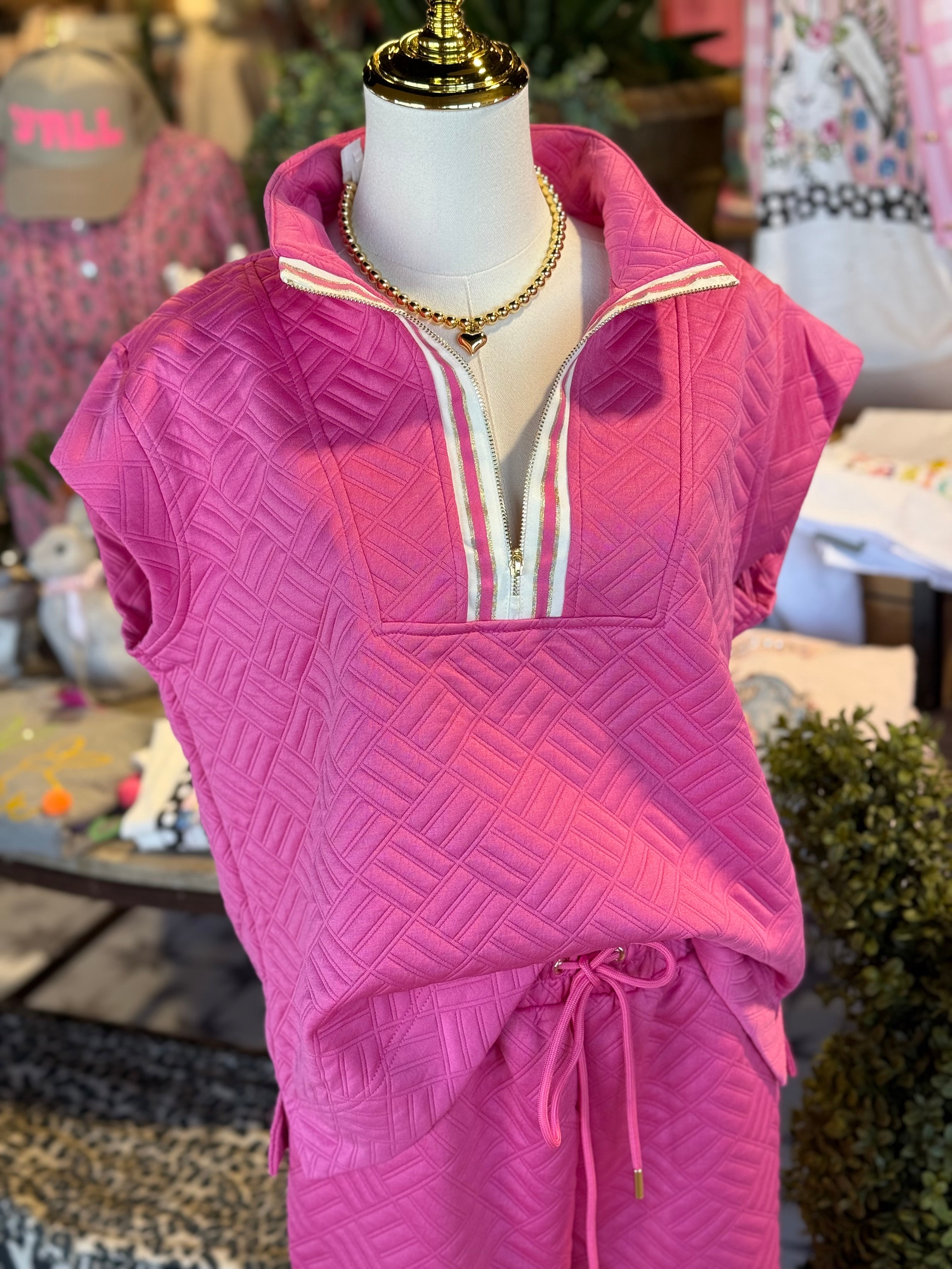 Pink textured set. Elastic waist. Zip and ribbon details.