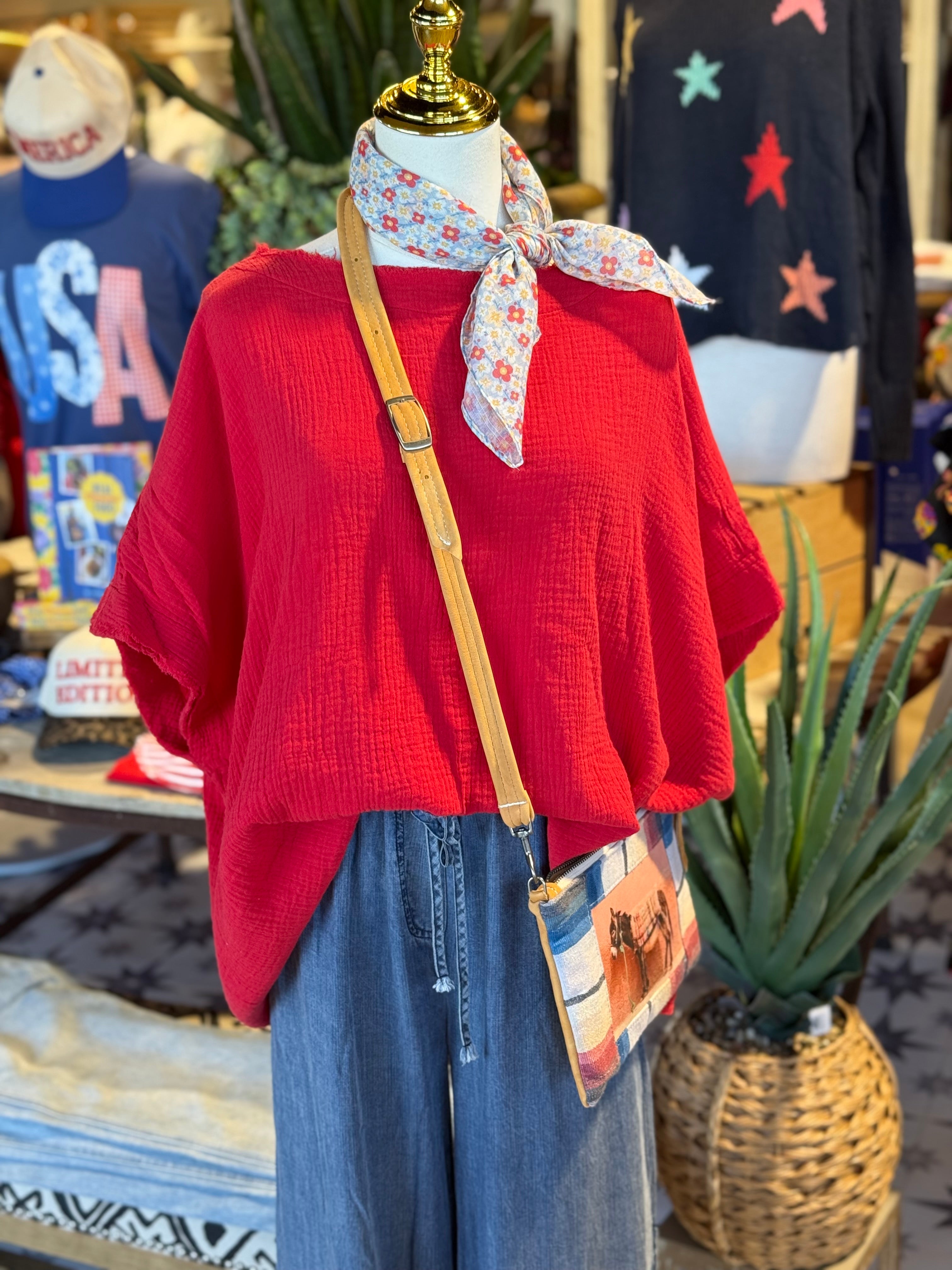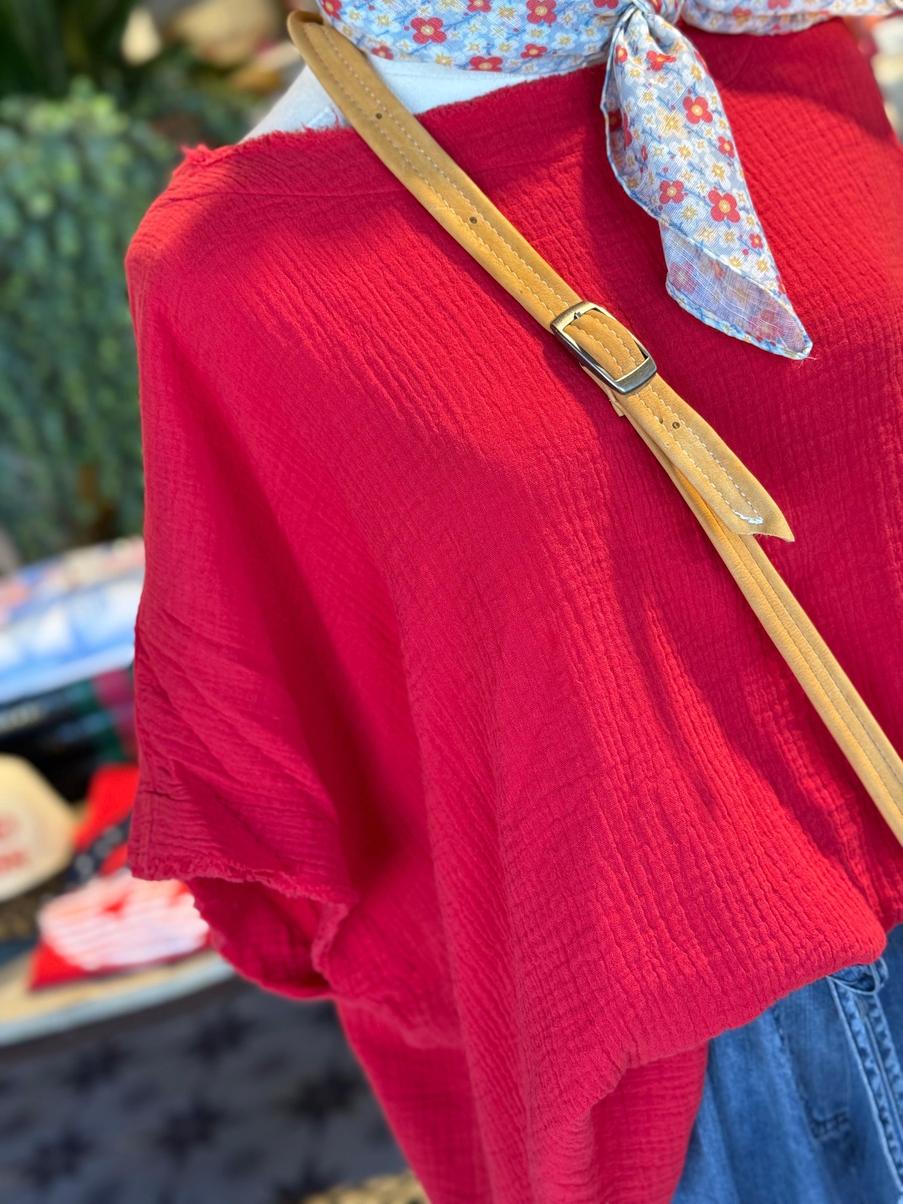 Effortlessly elevate your wardrobe with our oversized Red Hot Gauze Top. Crafted from luxurious lightweight fabric, this top boasts a frayed hem for a touch of edginess. Perfect for any occasion, its bold red color is sure to make a statement.