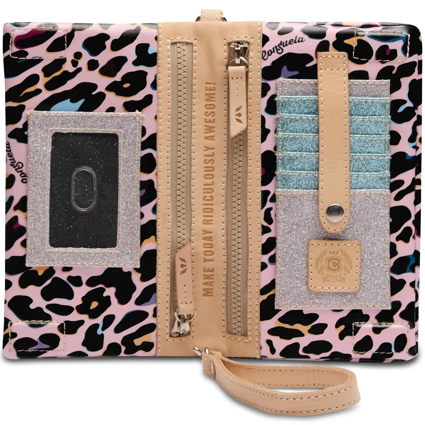 • Included detachable wristlet strap and adjustable woven crossbody strap