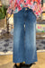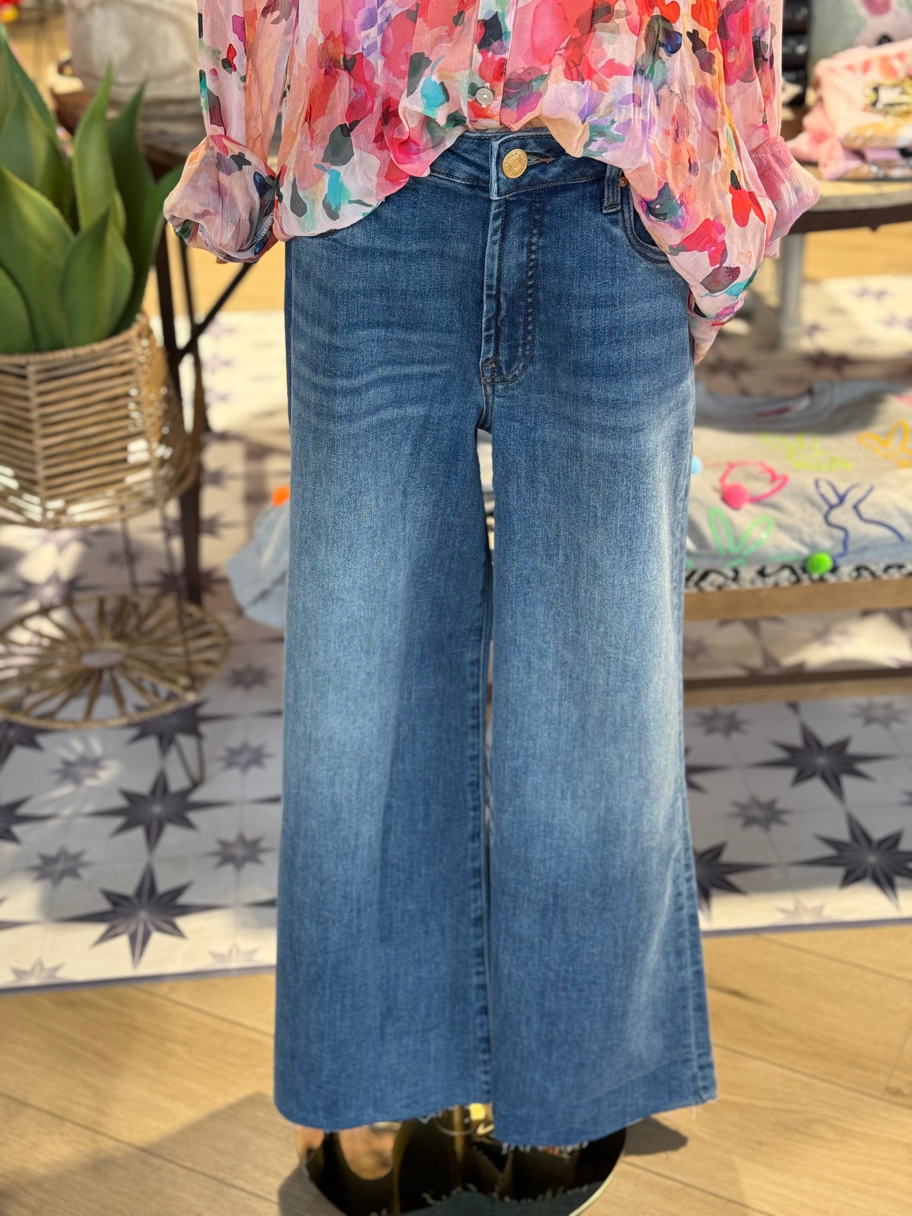 Flare denim with lots of great stretch but won’t get baggy. Front pockets. Distressed hem.