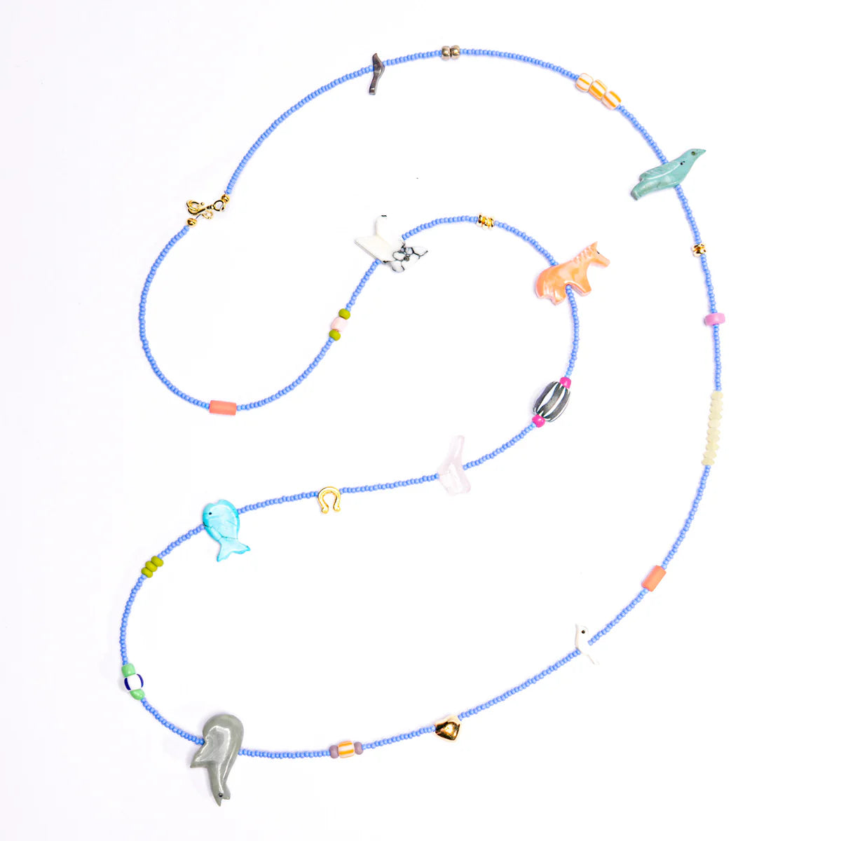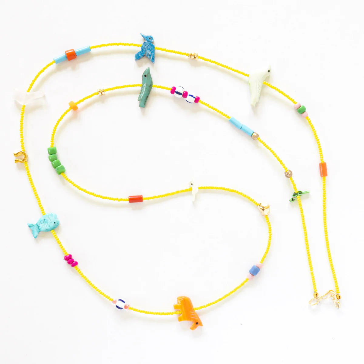 Named after the inspiration for this piece, she truly does it all. Wear long or double wrapped, measures approximately 41” long. Includes many staples from the line - gold horseshoe and heart, turquoise fish, fetish animals, 24k gold dipped spacers, African silver, and citron yellow beads.