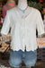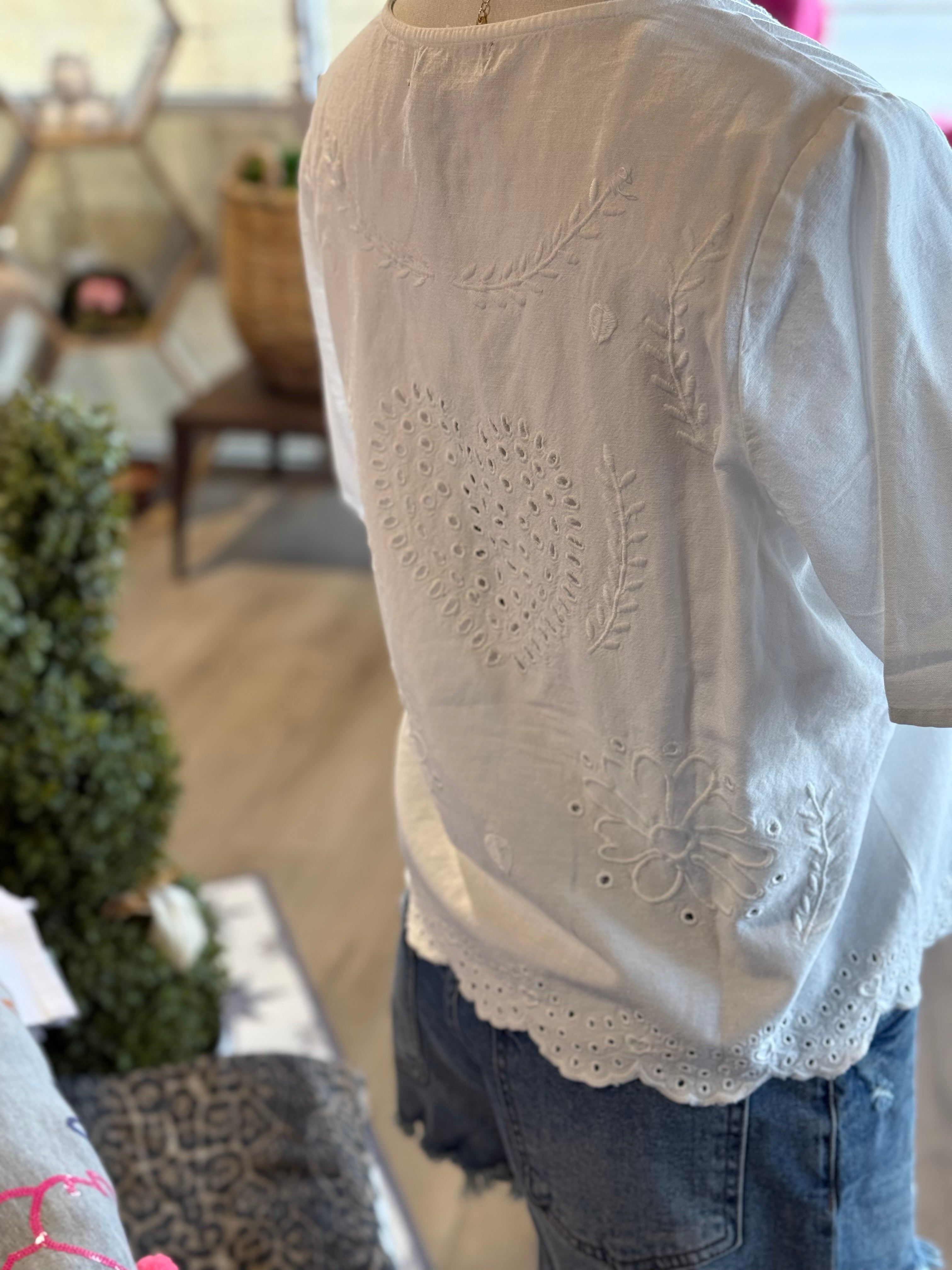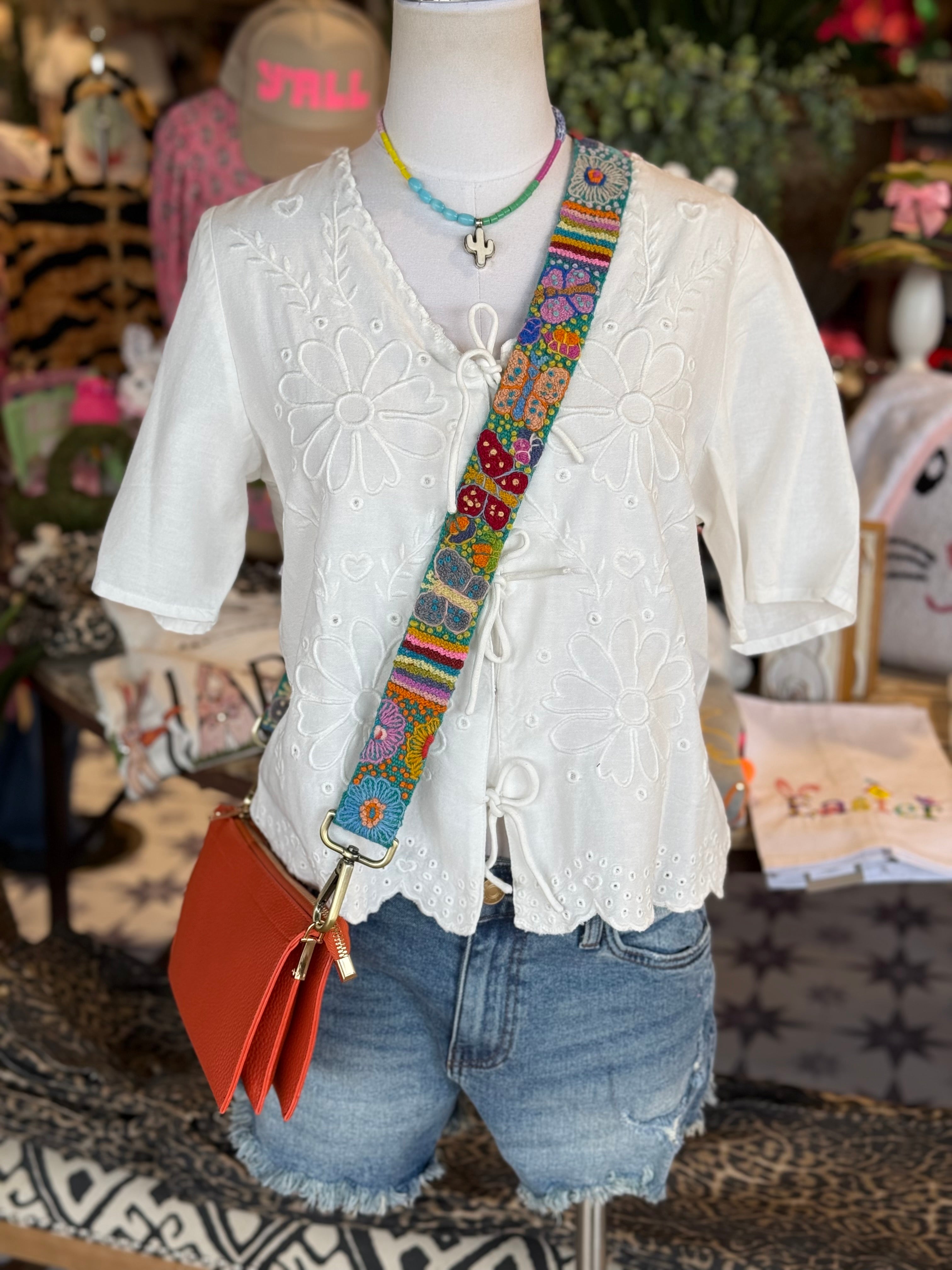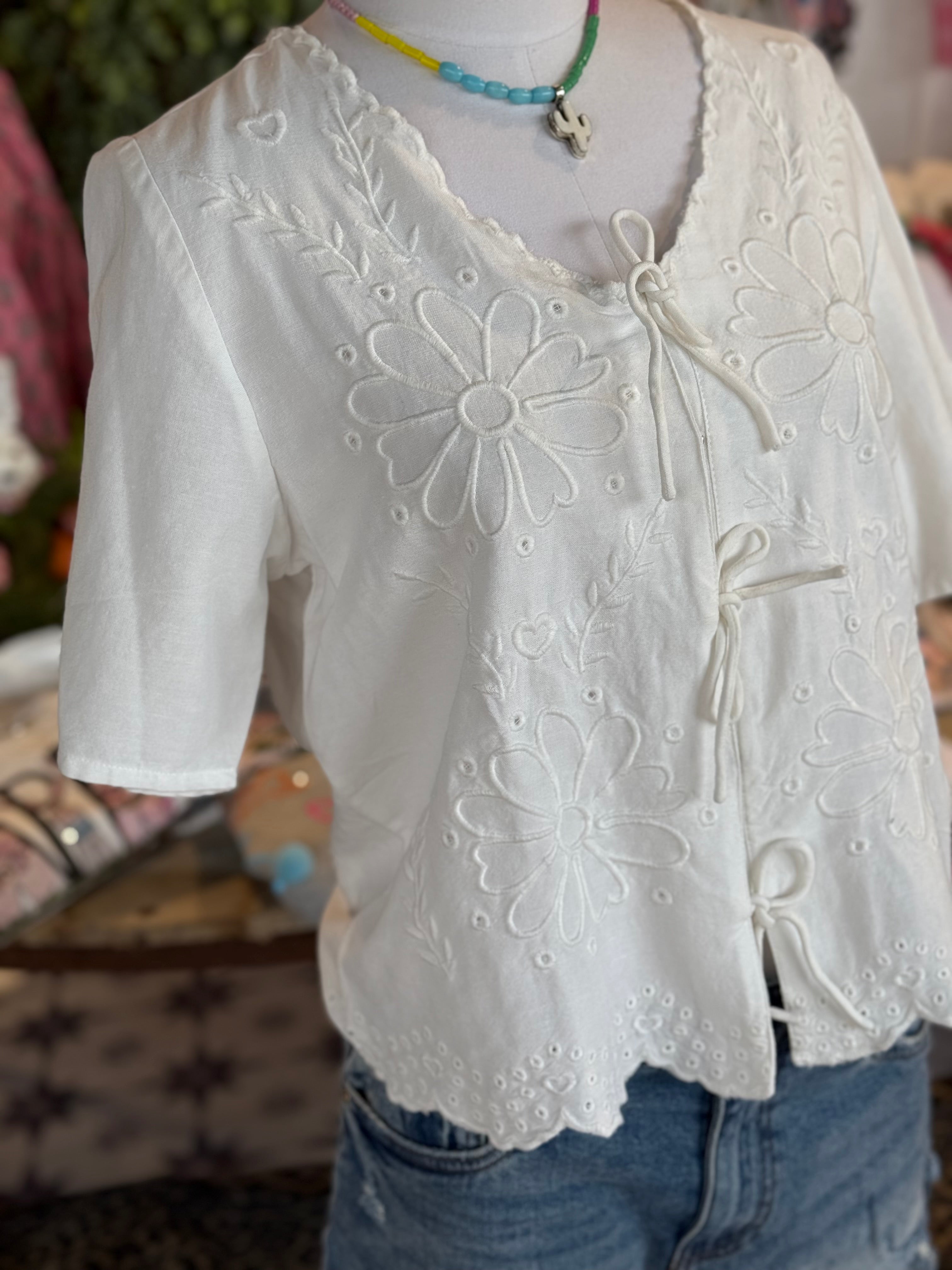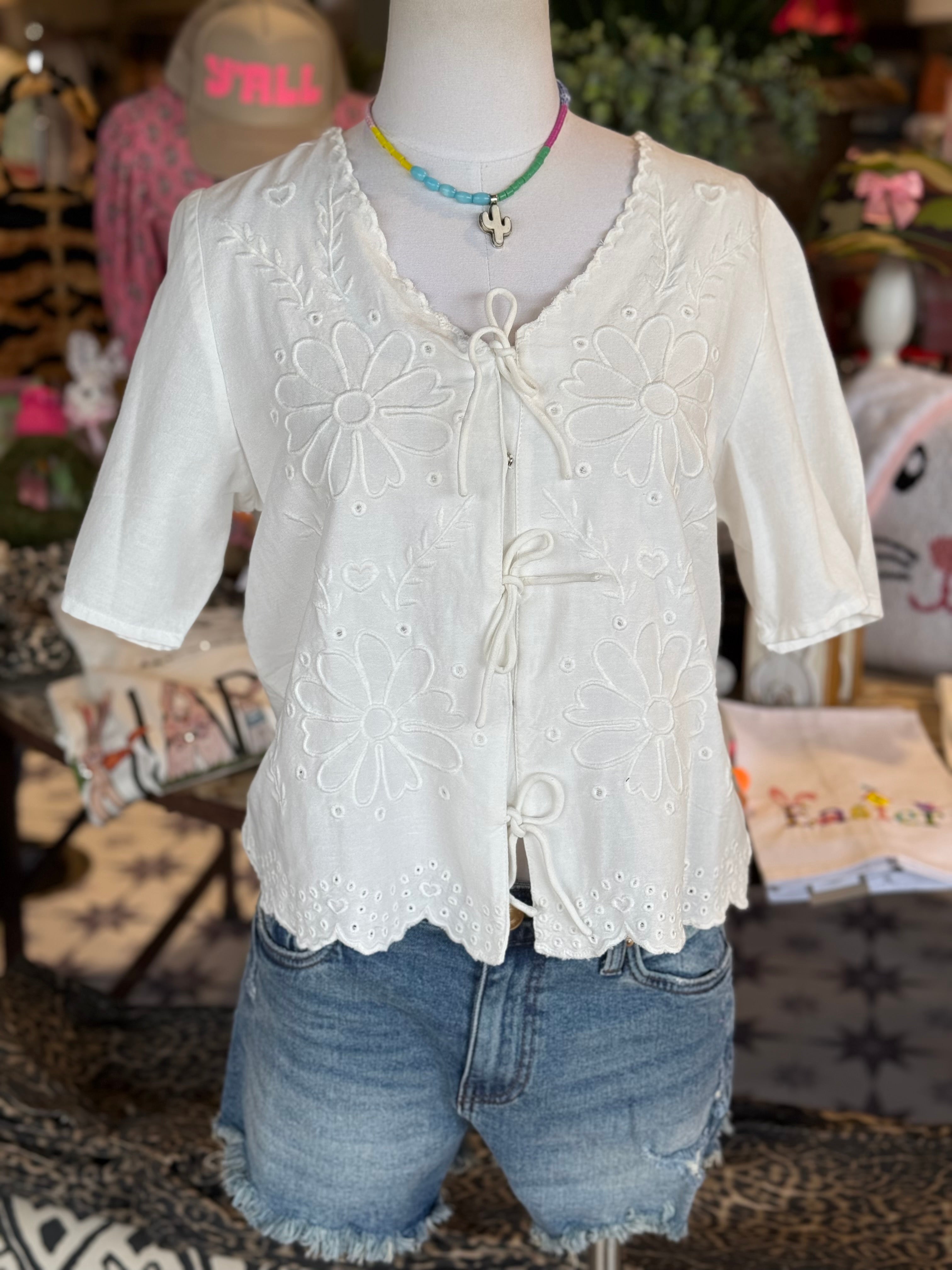 White cotton top with white embroidery detailing. Snap closure and bow tie details