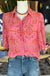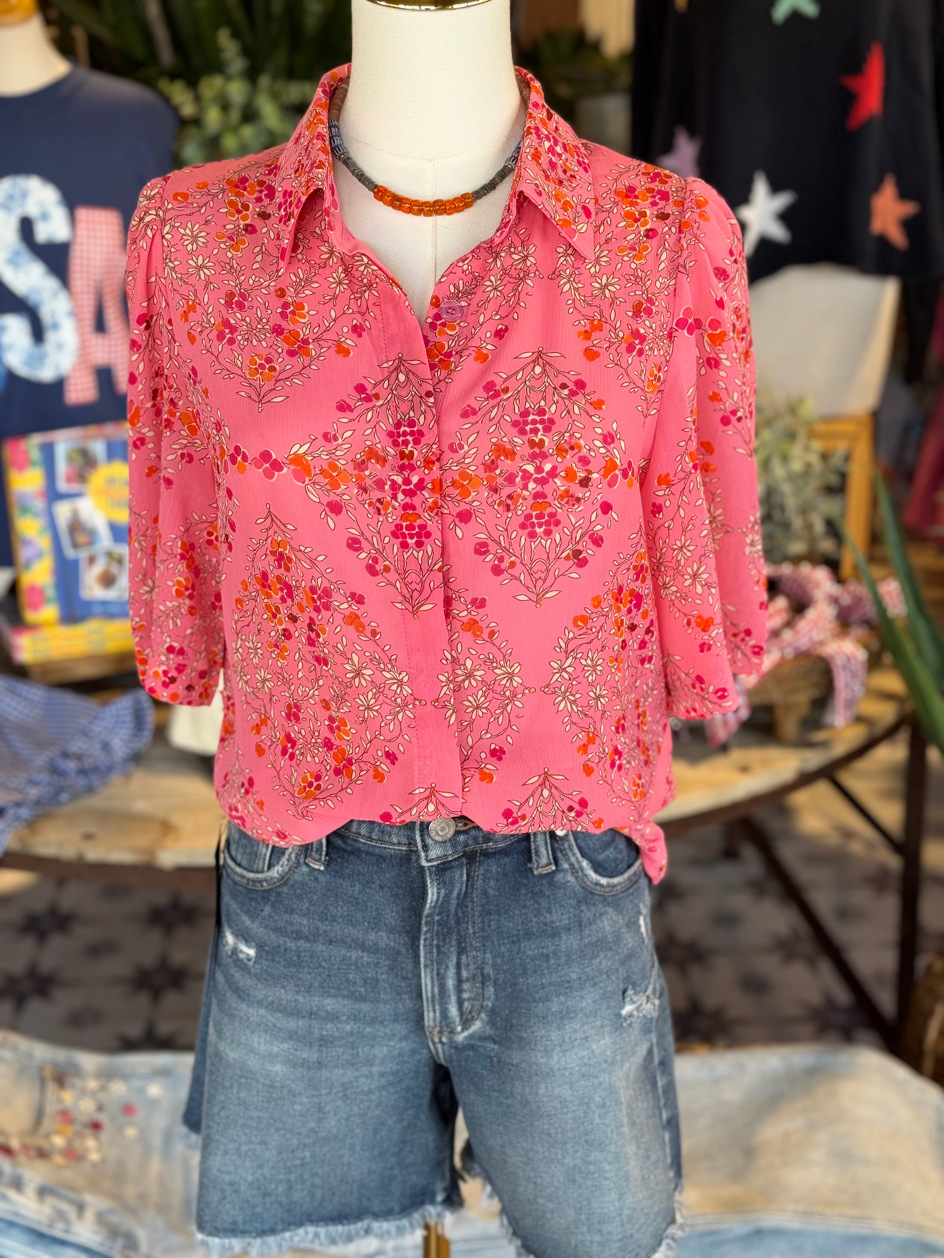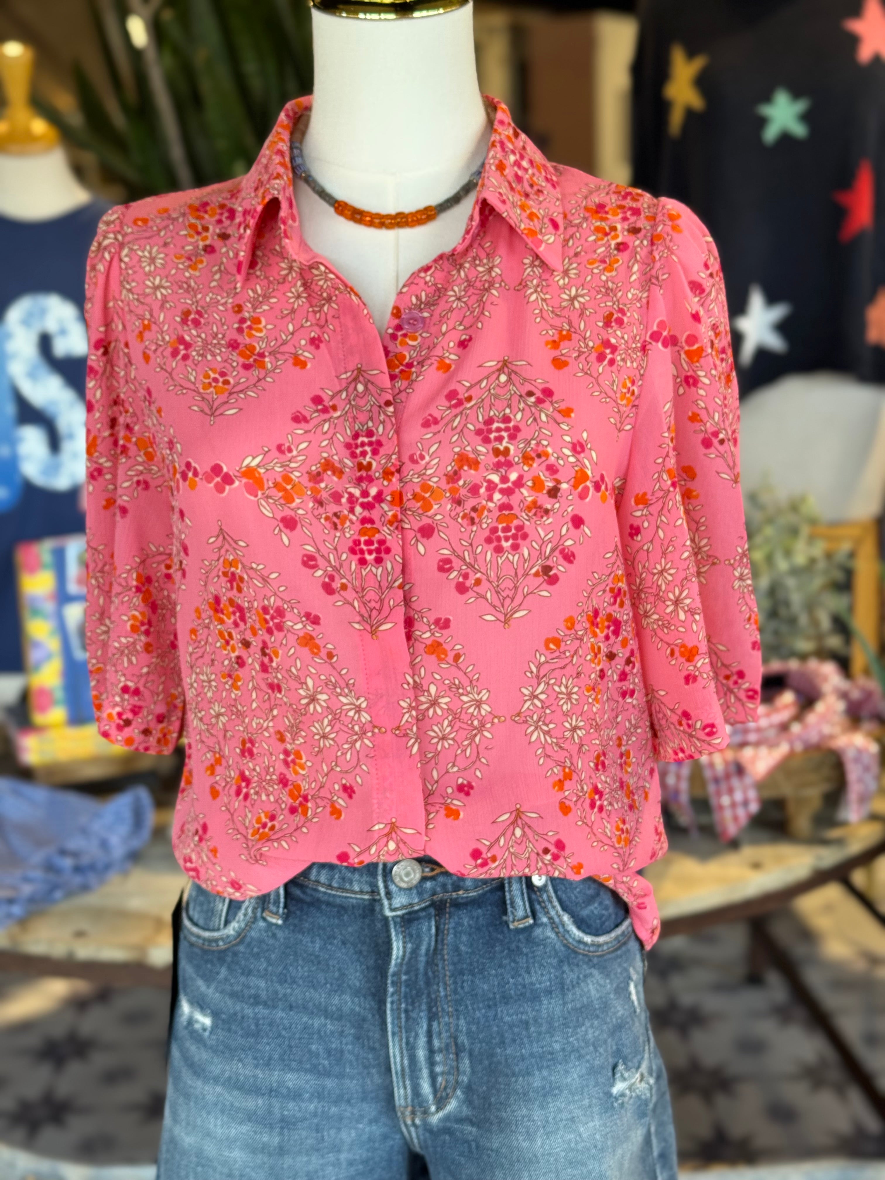 Get ready to bloom in the Susanna Top! This playful pink floral button-up features a charming collar that adds a touch of whimsy to any outfit. Perfect for adding a pop of color to your wardrobe, this top is versatile and stylish. (And it will definitely make you stand out in a crowd!)