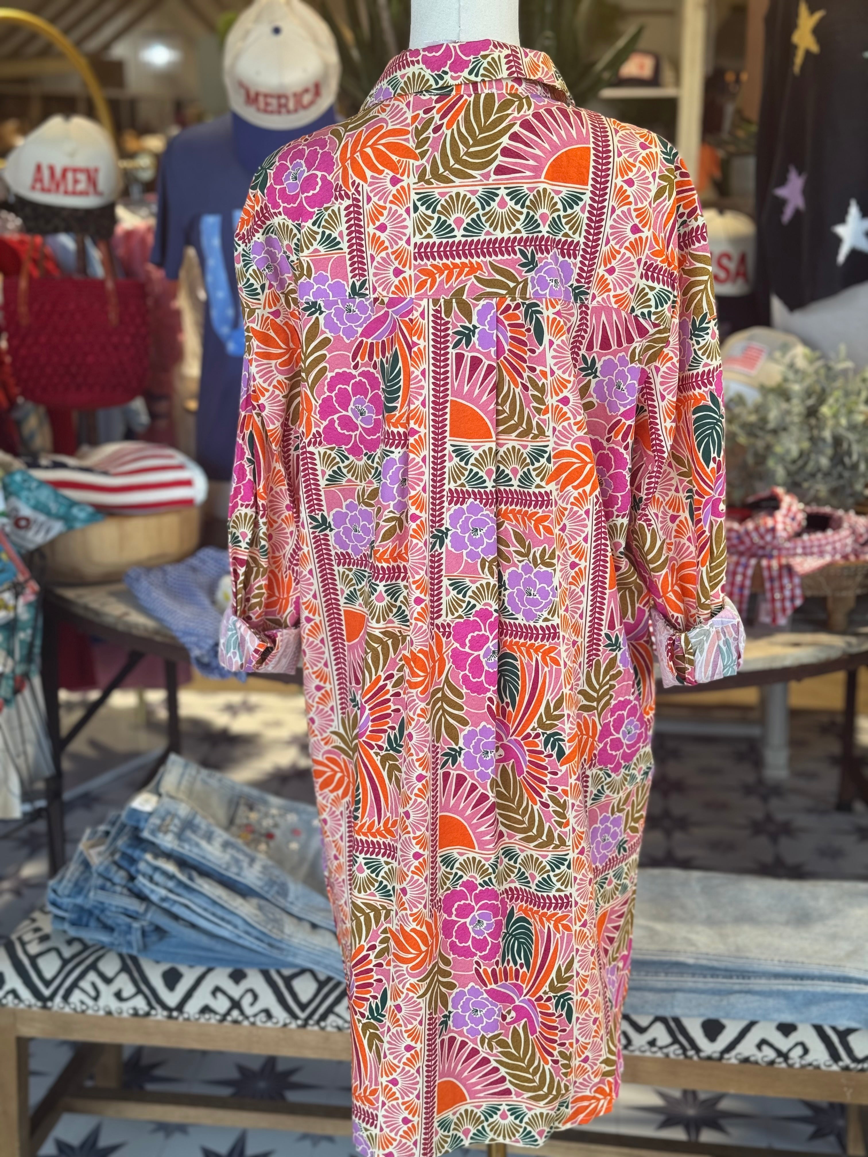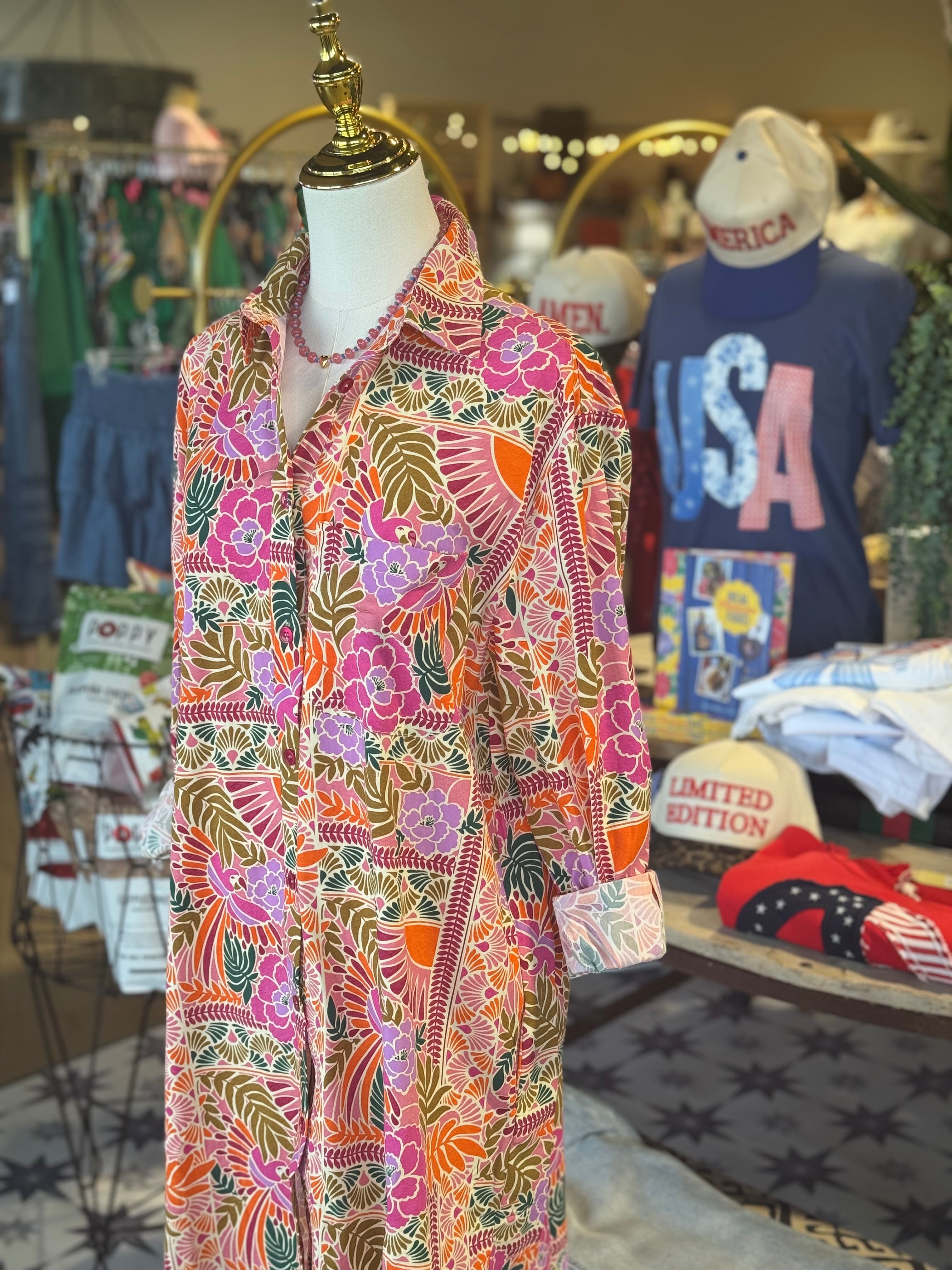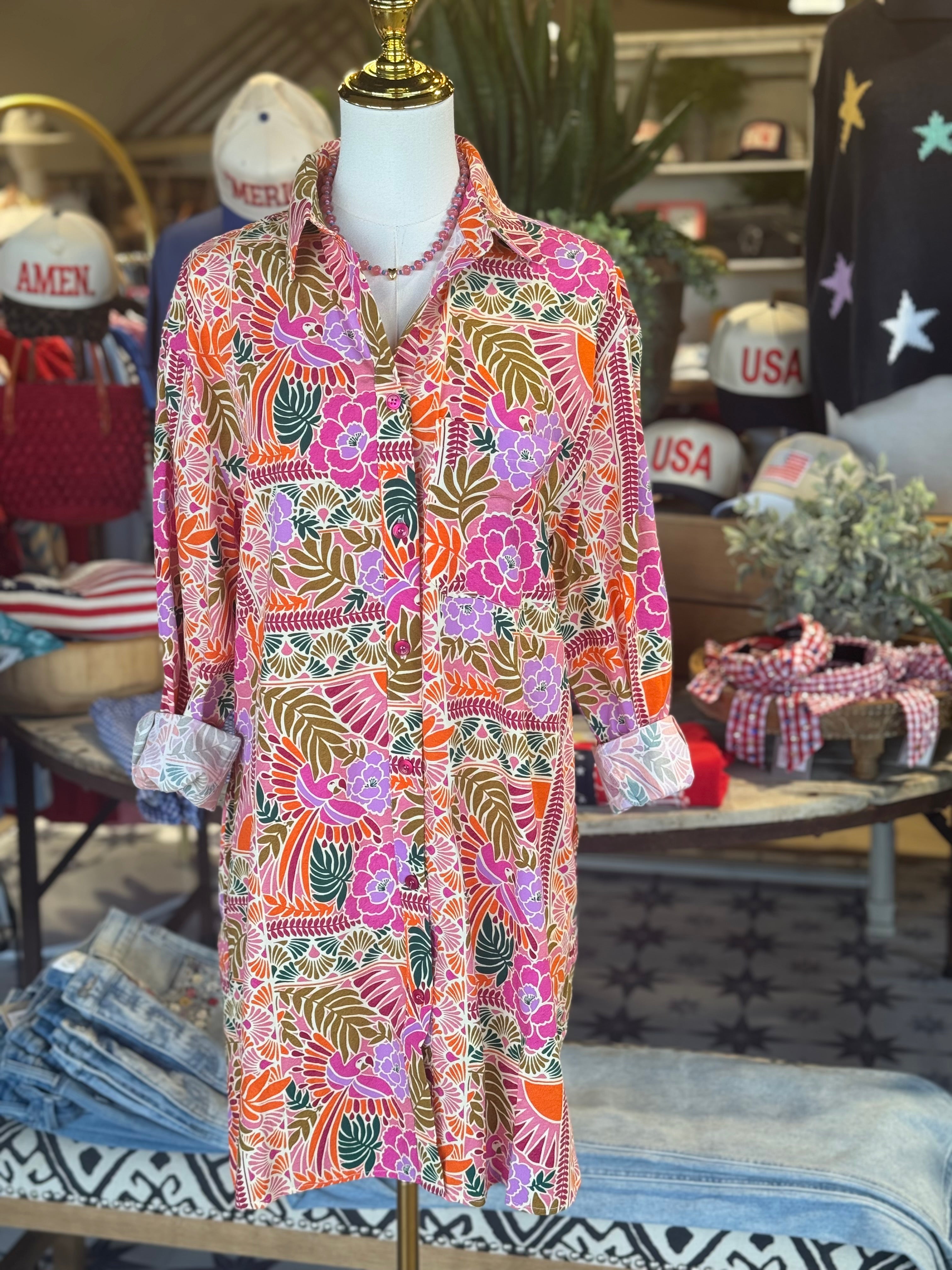 Unleash your wild side with our Toucan Scarf Shirt Dress! Featuring a bright and playful custom print, this dress is sure to turn heads. Perfect for a day out or a night on the town!