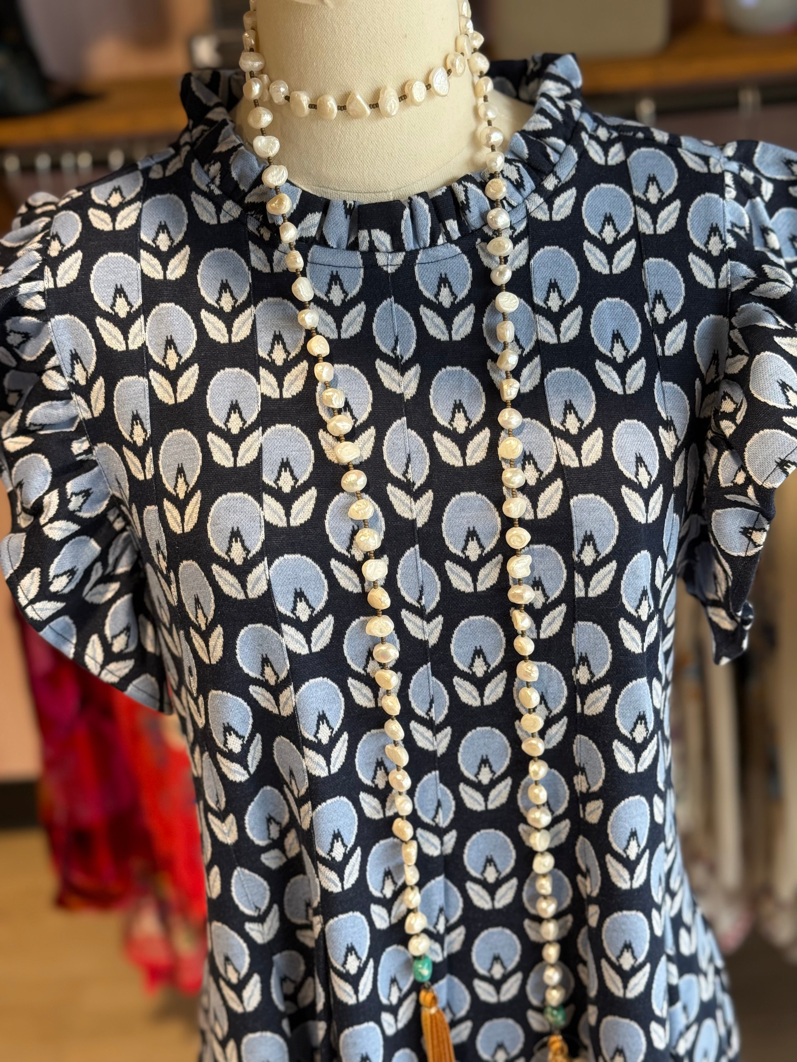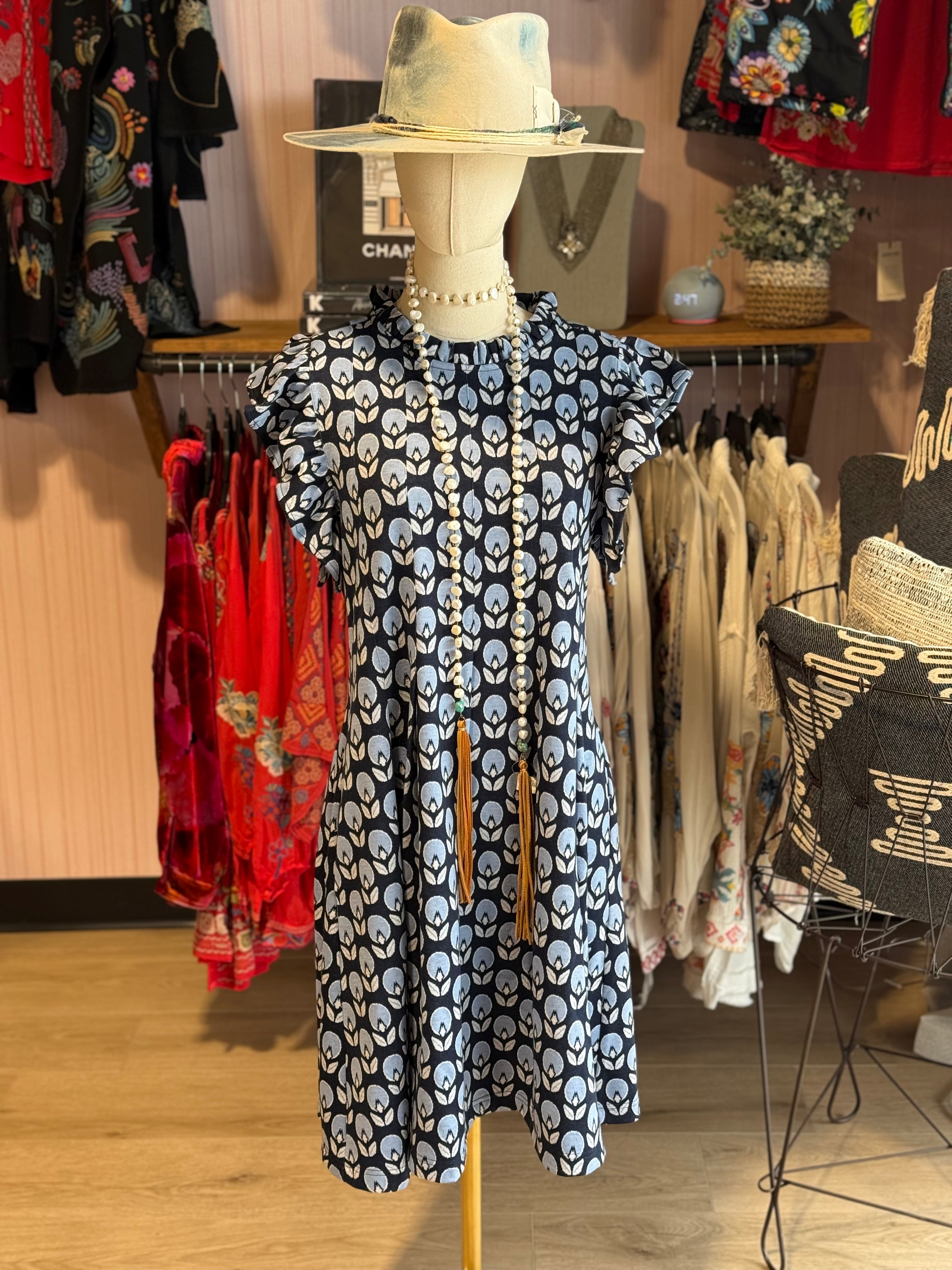 Blue knit dress with little ruffle on sleeves. Front pockets