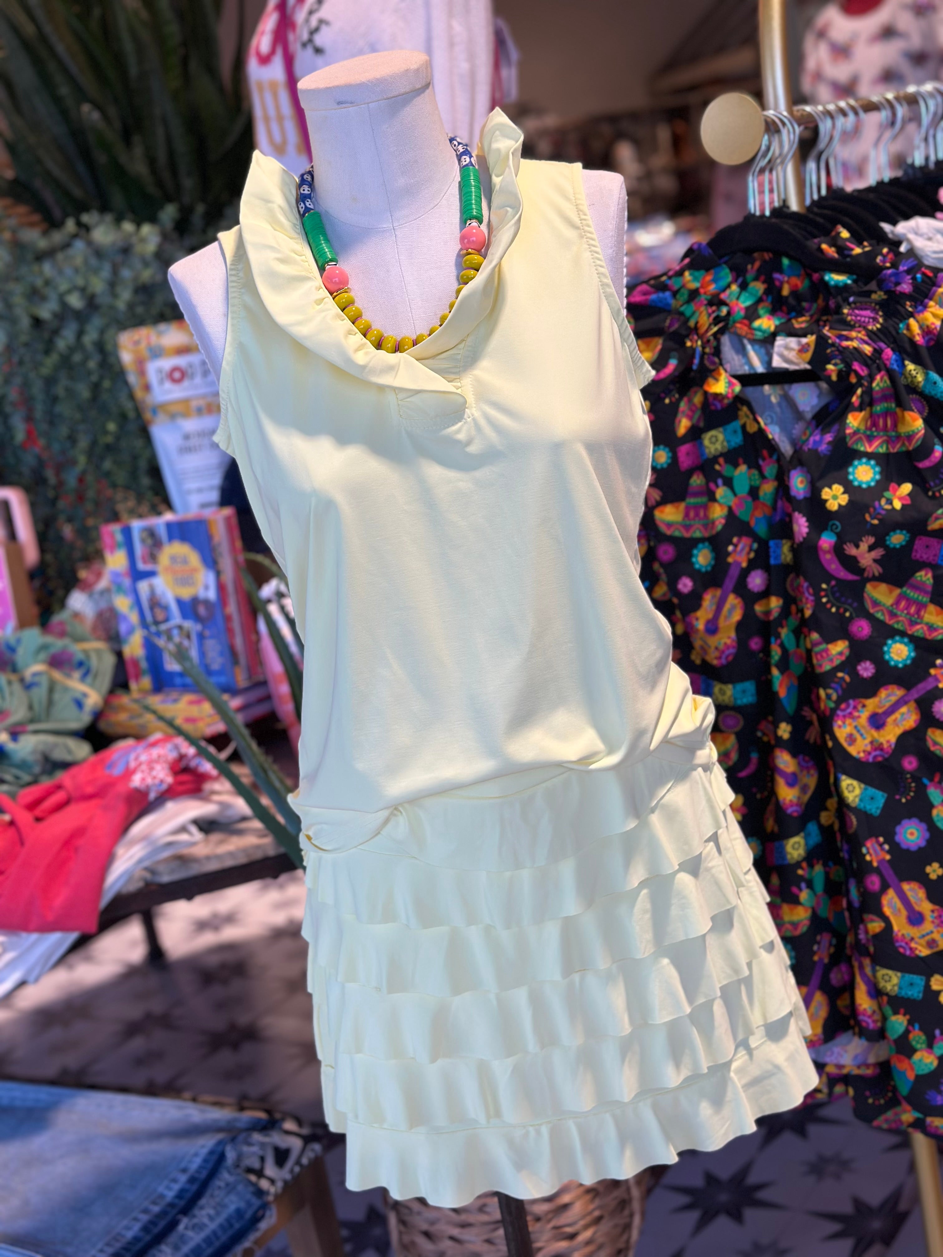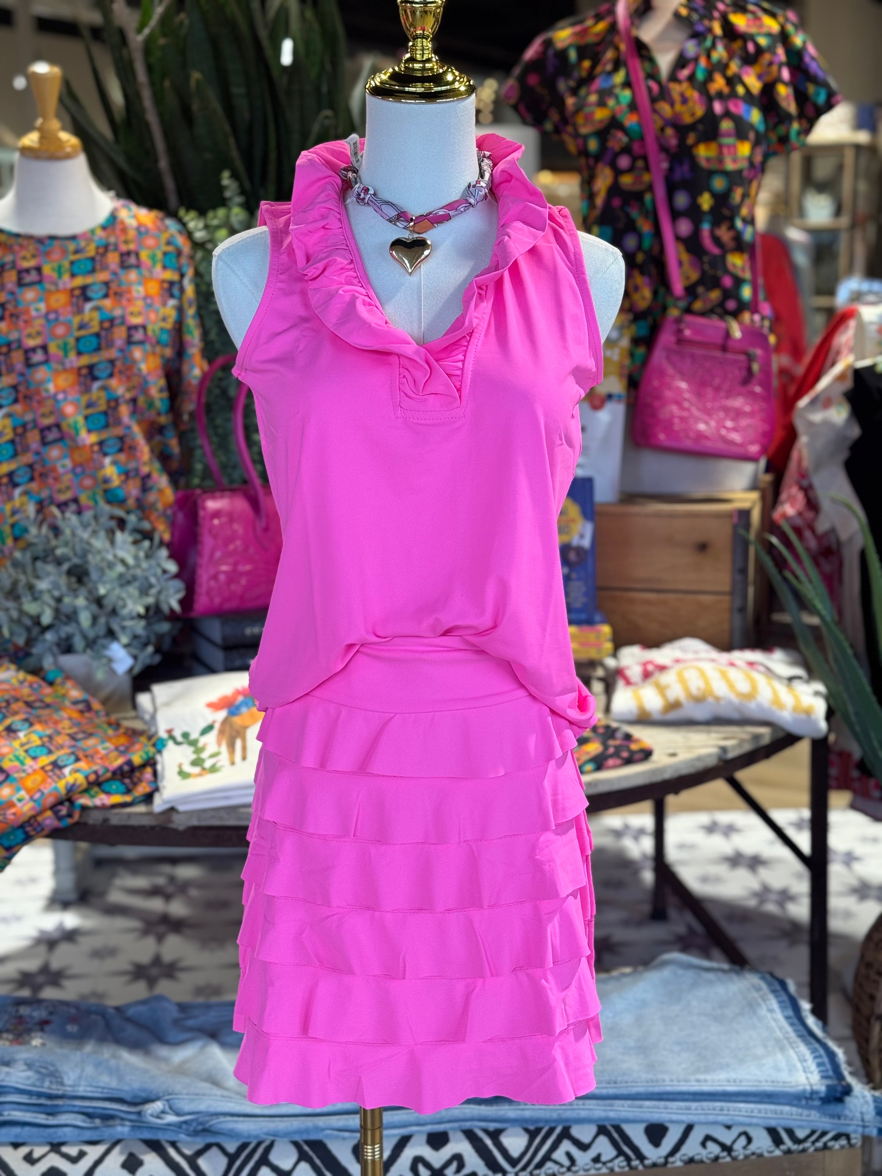Cool affect top with a ruffle detailing. Looks great with Mariah skort.