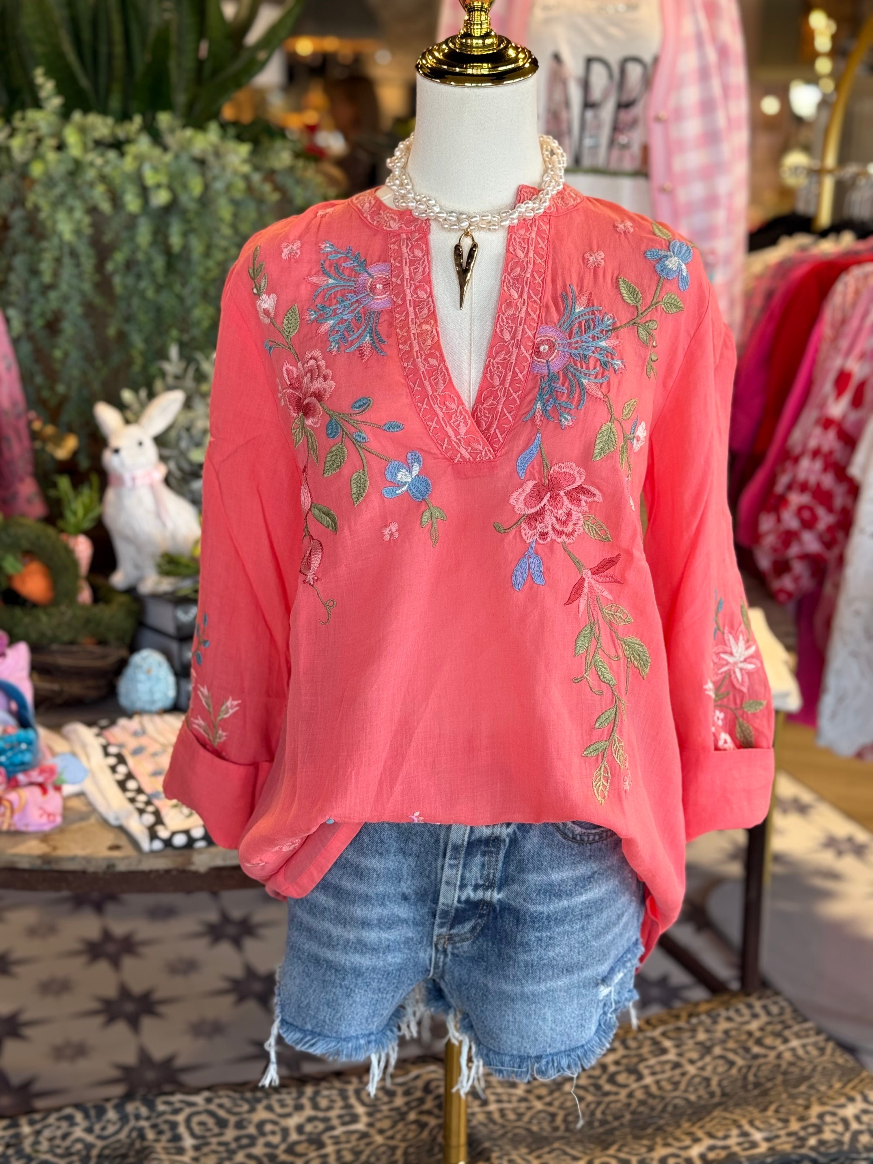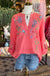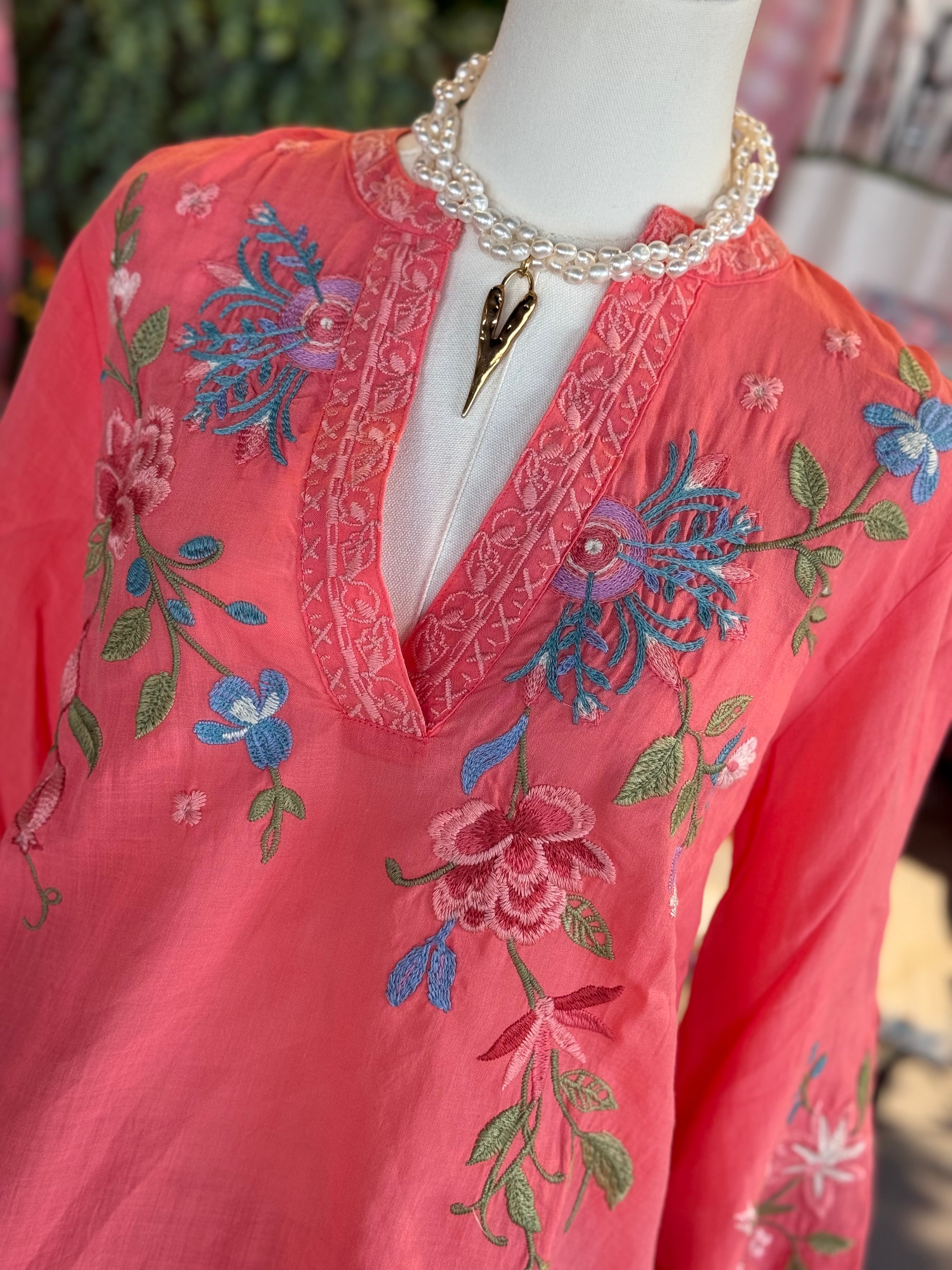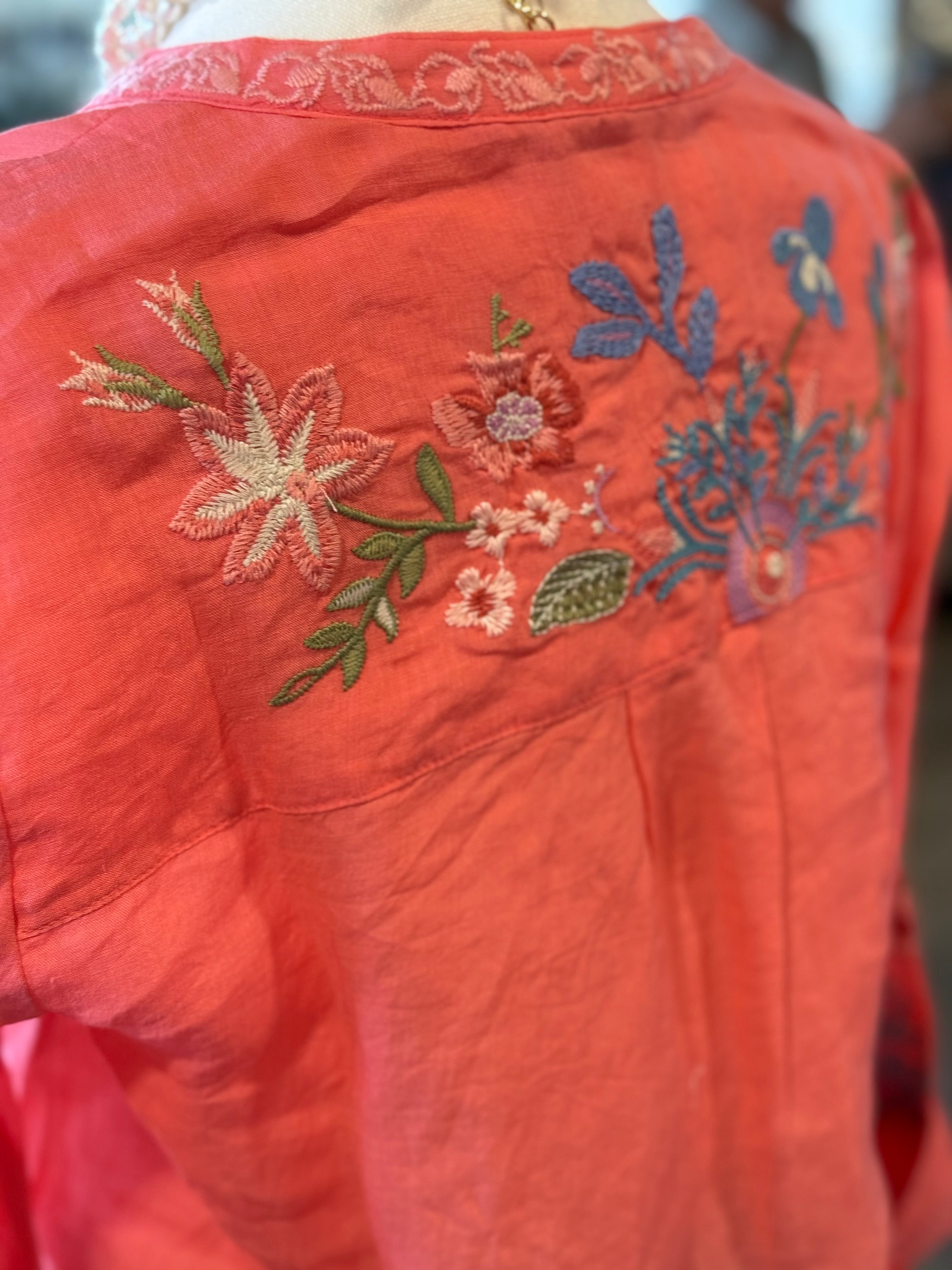 Beautiful coral tunic with embroidered detailing. V neck. 3/4 sleeve.