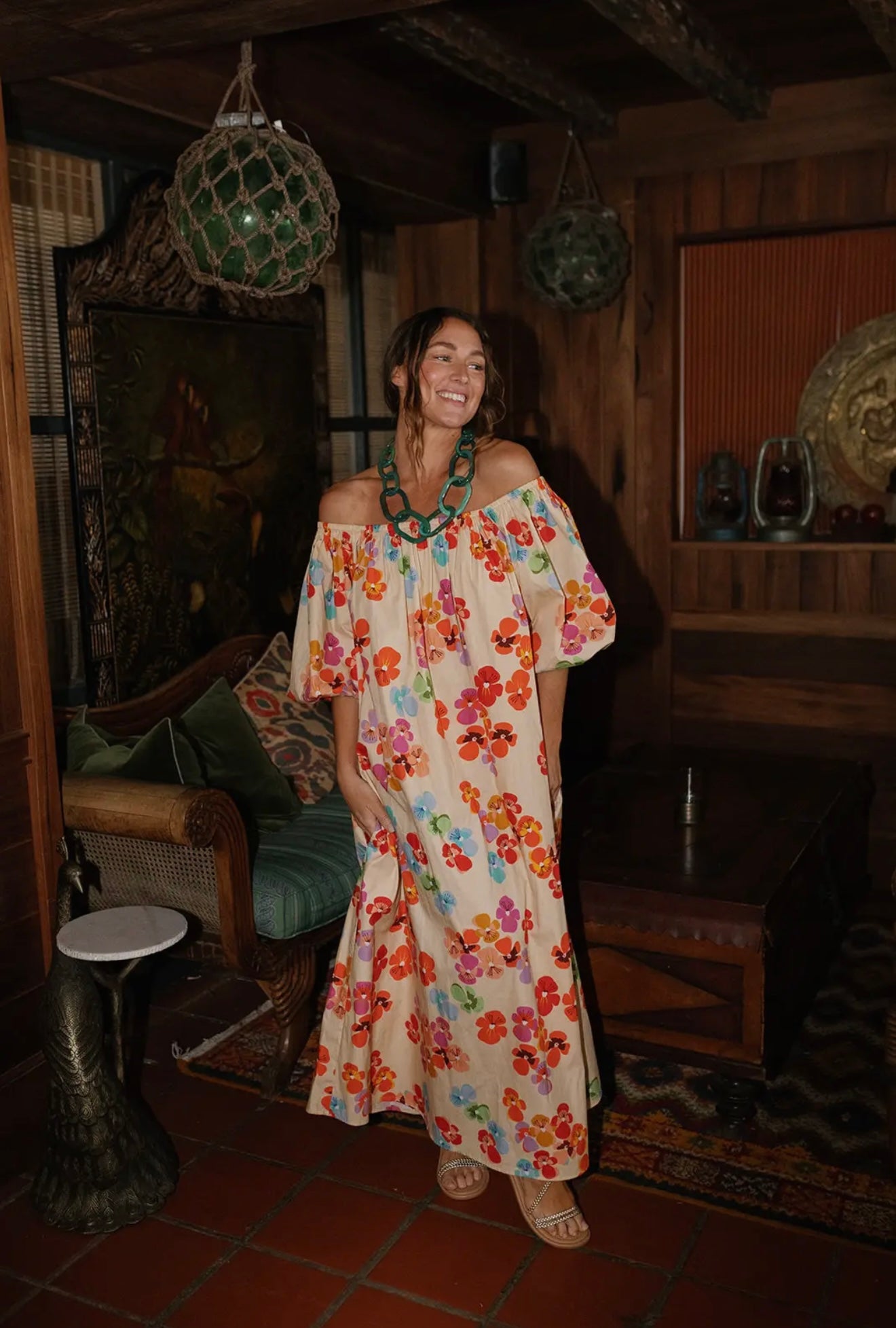 The Wild Child Dress features a playful multicolor floral print and versatile puff sleeves that can be worn on or off the shoulder. With its flowy silhouette, this dress is perfect for summer outings, offering both comfort and a vibrant, carefree style.